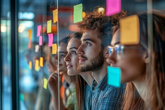 Young individuals focus intently on colorful sticky notes attached to a glass wall, engaging in a collaborative brainstorming session in a modern workspace