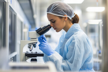 Young caucasian female scientist examining samples under microscope in laboratory