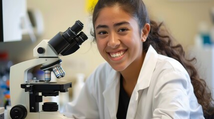 A young scientist smiles while working at a laboratory bench, using a microscope to explore samples during a science project