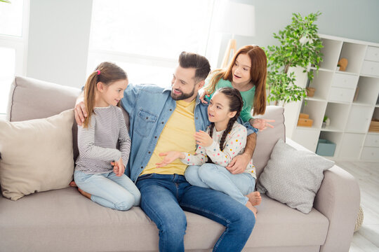 Mother's Day. Caucasian mother holds her two children, daughters while they hug and kiss her. Happy family of mom and girls sisters sitting on sofa at home.