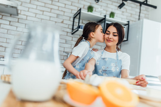 Portrait of two happy sisters. Kid kissing girl. Home cooking!
