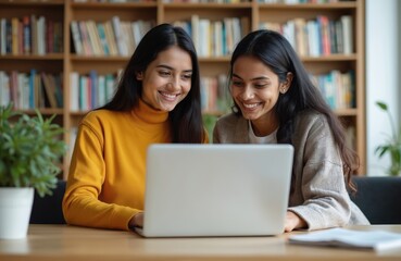 Two young adult Indian students work together on research study at laptop. Smiling women collaborate on educational project. Bookshelves background. Students watch online content. Collaboration,