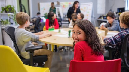 Diverse students engaging in classroom learning with red chairs
