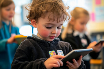 Curious little boy using a tablet during class in a modern educational setting, symbolizing early childhood education.