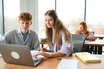 Group of college students studying in the school library, a girl and a boy are using a laptop and connecting to internet