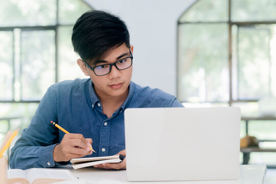 Group of college students studying in the school library, a girl and a boy are using a laptop and connecting to internet. Boy look to the camera