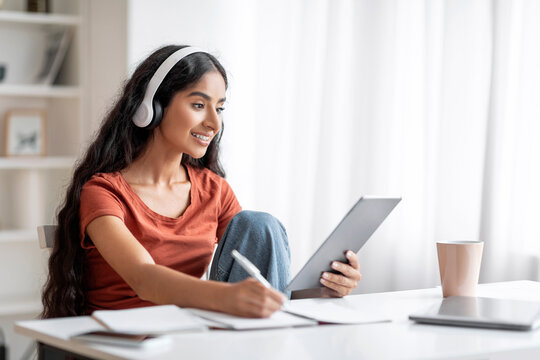 Student Young Indian Woman Using Digital Tablet, Headphones