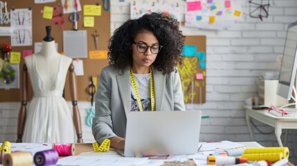 Professional woman engaged at her desk, showcasing modern workspace dynamics with laptop and notepad