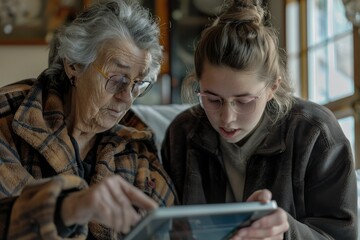 Tech Support A patient young person helping an elder navigate a new tablet, bridging the digital divide