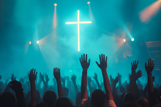 Christian worshipers raising hands up in the air in front of the cross