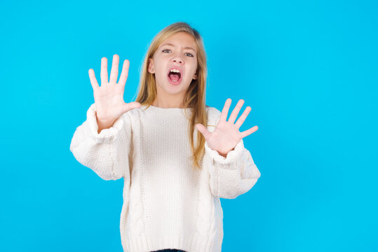 Dissatisfied caucasian little kid girl wearing wool jersey over blue background frowns face, has disgusting expression, shows tongue, expresses non compliance, irritated with somebody.