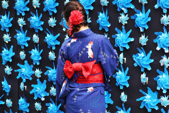 Unidentified japanese girl in traditional kimono dress  posing in front of a wall full of blue paper windmills in Tokyo