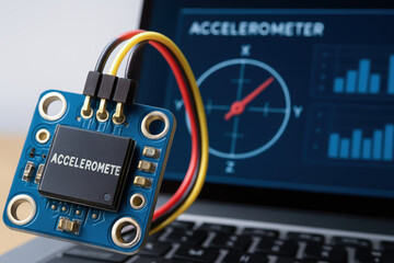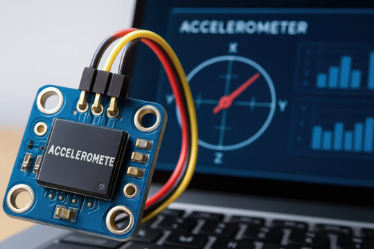 Compact accelerometer module with cable on laptop keyboard inspiring engineering education and innovation in sensor design and motion analysis