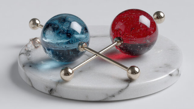 Cluster of glass pins with ceramic X, Y, Z arrows on white marble disc in sharp focus