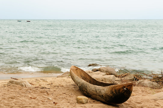 Traditional dugout canoe on the beach on the lake Malawi