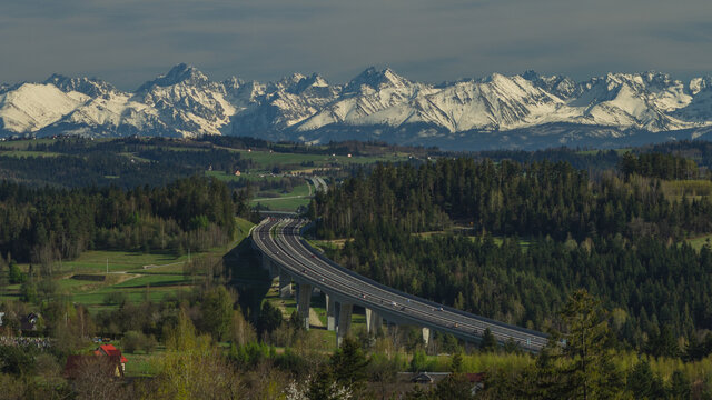 RABKA ZDROJ, POLAND - MARCH 19, 2023: The Zakopianka road near Rabka Zdroj city, Poland.
