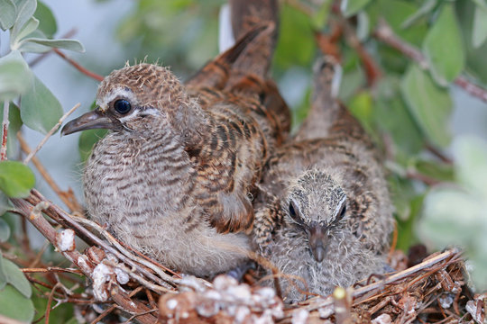 Mauritian zebra dove native bird wildlife perched and nesting in the middle of large palm leaf sitting on three blue and grey eggs showing grey striped chest and tail feathers