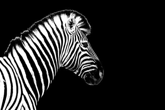 One zebra black background isolated closeup side view, single zebra head profile portrait, black and white art photography, striped animal pattern, african wild nature monochrome wallpaper, copy space
