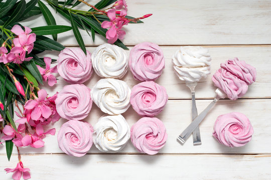 Homemade pink marshmallow from currant on a white background with pink flowers, home zephyr