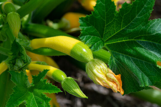 Young zephyr zucchini squash on the plant
