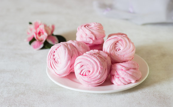 Beautiful delicious dessert. Pink zephyr on a white plate and pink flower. Berry zephyr on light gray background.