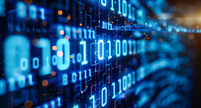 digital codes flow, showing a pattern of ones and zeros in blue and white, symbolizing technological progress. generative ai
