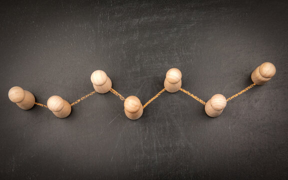 Creative representation of data analysis and statistics using wooden figures connected by a zigzag line symbolizing a graph on a dark chalkboard background