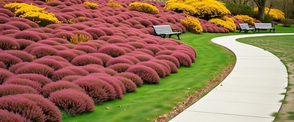 Zigzagging concrete path beside a sloping heather garden; dense park benches & yellow flowering bushes in background, zigzag, bushes