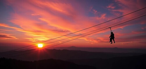 Silhouetted ziplines against a vibrant sunset, showcasing adventurous lines across a landscape,  speed,  landscape