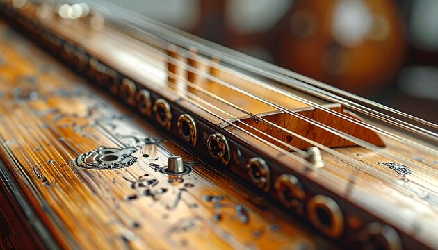 Close-up of a traditional Chinese Guqin zither with strings and tuning pegs.