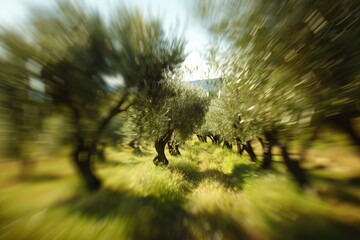 Radial zoom blur effect applied to olive trees in a plantation, creating an abstract background with motion effect