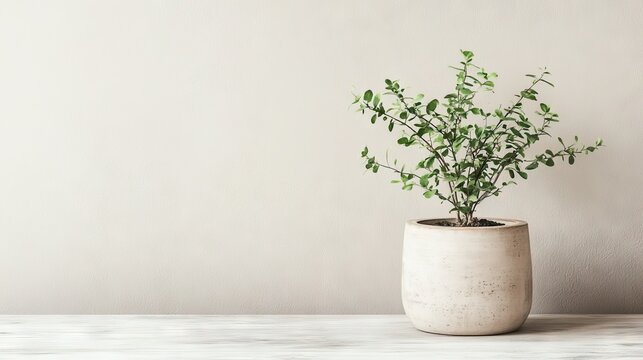 A simple Zoom background with light gray tones, a plant in a ceramic pot, and soft decor
