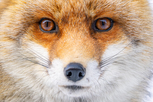 A captivating close-up of a Red Fox, emphasizing its sharp eyes and striking fur pattern, set against a snowy backdrop