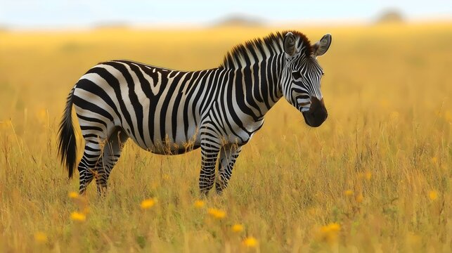 A magnificent zebra, its striking black and white stripes stand out in the tall, golden savanna grass.