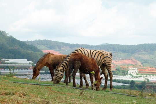 Striking Horses Grazing in Lush Hillside Meadow, under Cloudy Sky. Langbiang, Dalat, Vietnam.