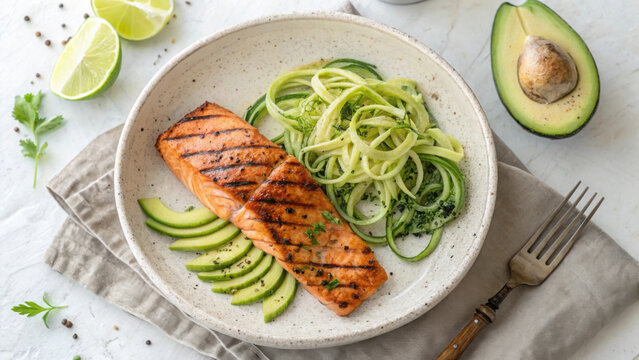 Grilled salmon served with zucchini noodles and avocado slices, garnished with lime
