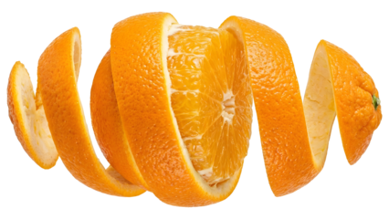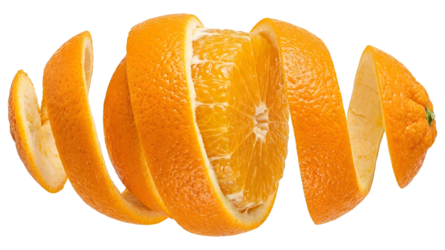 Floating spiral orange peel with separated layers, isolated on black background