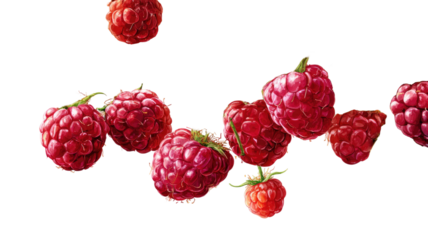 Fresh ripe raspberries floating juicy red berry fruit food nutrition macro studio closeup isolated on white background
