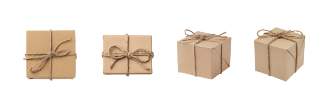 Brown Kraft Paper Gift Boxes Set. Eco-Friendly Packaging And Sustainable Gift Wrapping Collection Isolated On Transparent Background