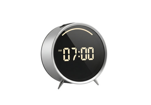 A sleek modern digital alarm clock showing the time 07:00 am against a black background