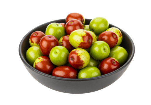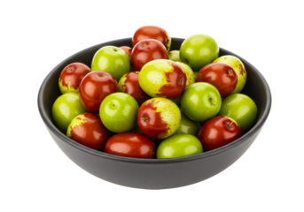 黒いボウルに入った赤と緑色の丸い果物のクローズアップ写真
