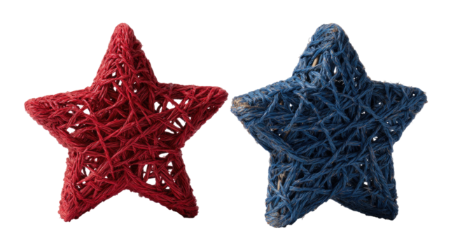 Two decorative stars, one red and one blue, crafted from woven twine, isolated on black