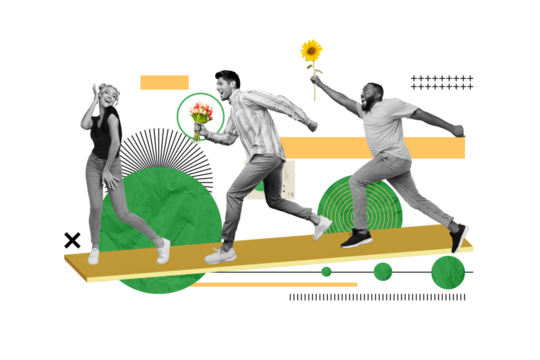 Collage photo of two lovers one girlfriend international woman day spring time gift tulips bouquet another sunflower isolated on drawing background