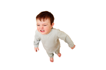 Little baby whimpers and is naughty, isolated on white background. Small child is crying and suffering in the home living room, isolated on white background. Kid aged one year nine months