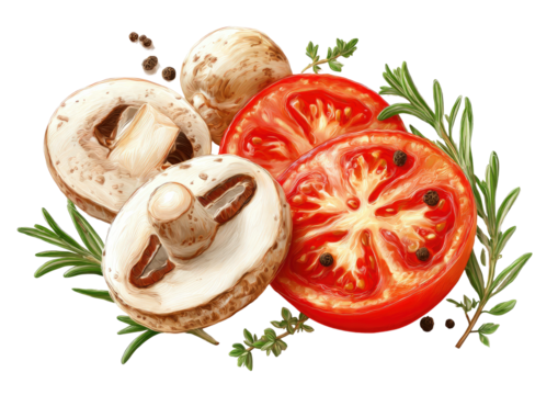 Culinary graphics with coral spatula and mushrooms on transparent background