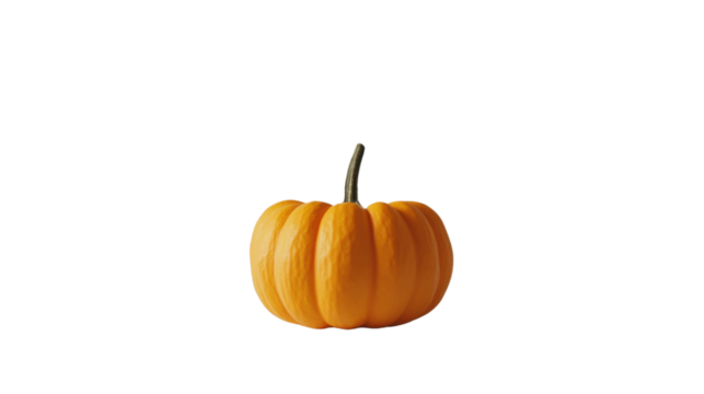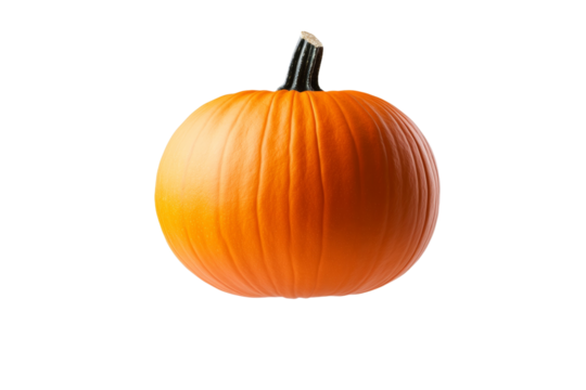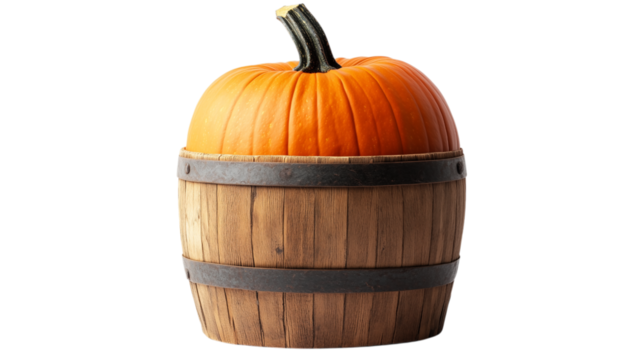 Ripe orange pumpkin sitting on a wooden barrel isolated on a transparent background