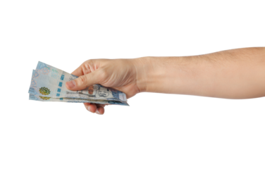 Hand-holding Saudi banknotes isolated on a white background.