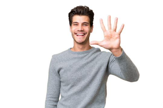 Young handsome caucasian man over isolated background counting five with fingers