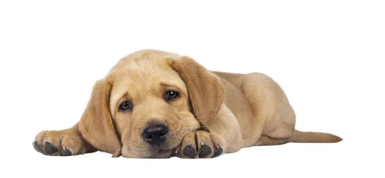 Adorable 7 weeks old Labrador dog puppy, laying down. Head down, looking very tired towards camera. Isolated cutout on a transparent background.