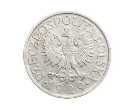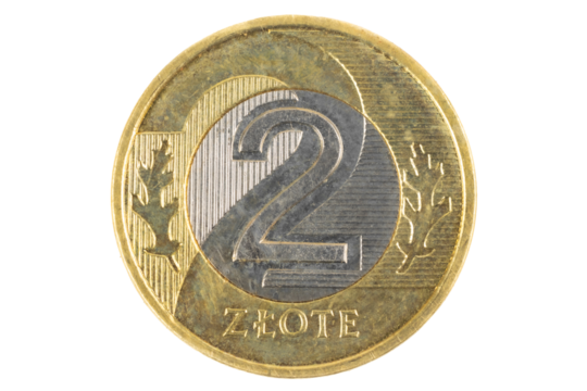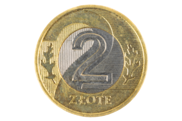 Isolated Polish one Zloty coin macro, currency of Poland, front view. Close-up detail